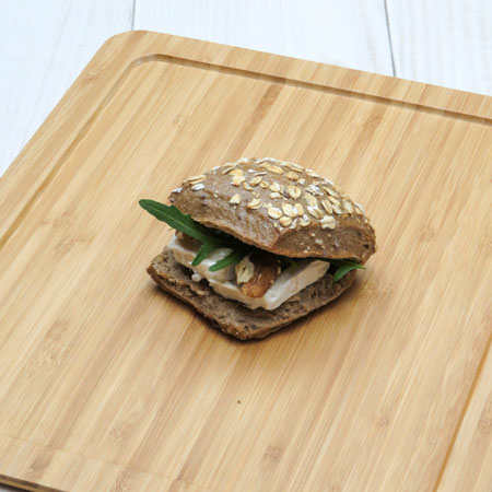 Mini-pain, fromage de chèvre en tranches, miel, noix, roquette